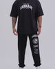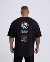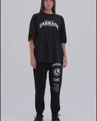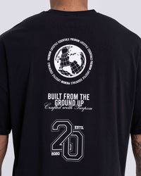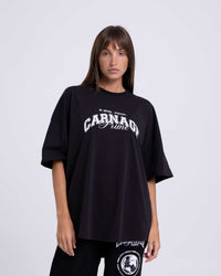 An elevated black staple with a relaxed drape and clean curved hem. Lightweight cotton keeps it comfortable, while the classic emblem-style badge print add a standout finish.